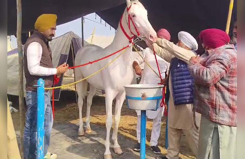 Kurukshetra News, (आज समाज) कुरुक्षेत्र: हरियाणा के कुरुक्षेत्र के पिहोवा में आयोजित पशु मेले में पंजाब से पहुंचा घोड़ा आकर्षण का केंद्र बना हुआ है। घोड़े की कीमत 1 करोड़ रुपए बताई जा रही है। मारवाड़ी नस्ल के नुकरे घोड़े का नाम प्रताप रूप है, जो सिर से पैर तक पूरी तरह सफेद है। घोड़े की उम्र 28 महीने की है और यह 67 इंच ऊंचा है। घोड़ा पंजाब के संगरूर से लाया गया है। लोग घोड़े के साथ फोटो खिंचवाने आ रहे हैं। घोड़े के मालिक मालिक सरपंच हरप्रीत सिंह और उनके पिता निर्भय सिंह ने बताया कि इसकी 1 करोड़ रुपए तक की कीमत लग चुकी है। मगर, उन्होंने इसे नहीं बेचा।