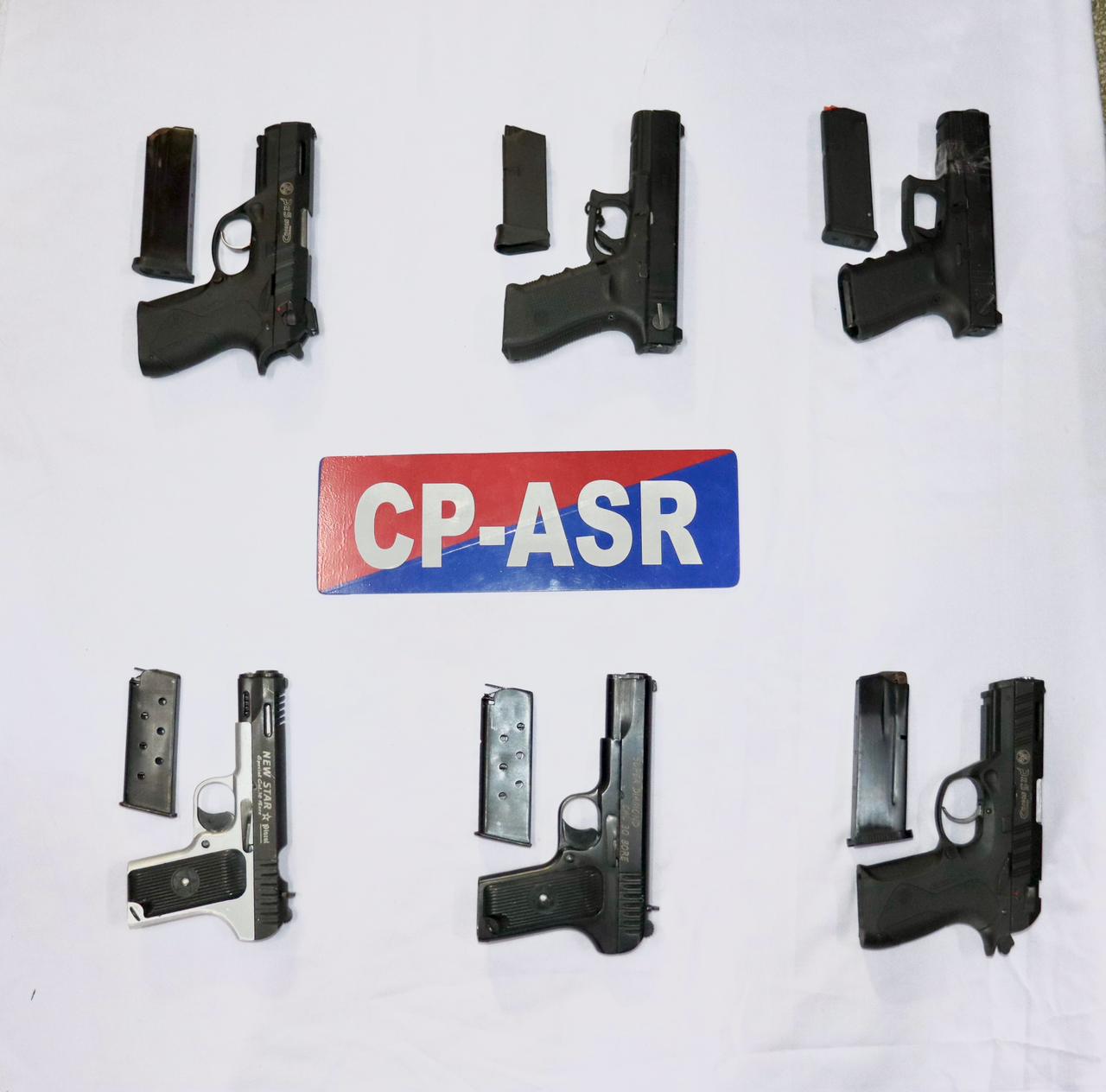 गिरफ्तार किए गए व्यक्तियों की पहचान गांव कोटली वसावा सिंह (जिला तरनतारन) के रहने वाले गुरबीर सिंह उर्फ सोनू (28), गुरप्रीत सिंह उर्फ़ गोपा (32), खेम करन (तरनतारन) निवासी गोरका सिंह उर्फ गोरा, राजविंदर सिंह उर्फ राजू, भीखीविंड (अमृतसर) निवासी जसपाल सिंह उर्फ जस (24) और सुल्तानपुर लोधी के रहने वाले 16 वर्षीय नाबालिग के रूप में हुई है। बरामद पिस्तौलों में 5 .30 बोर पिस्तौल और एक 9 एमएम पीएक्स-5 पिस्तौल शामिल हैं।