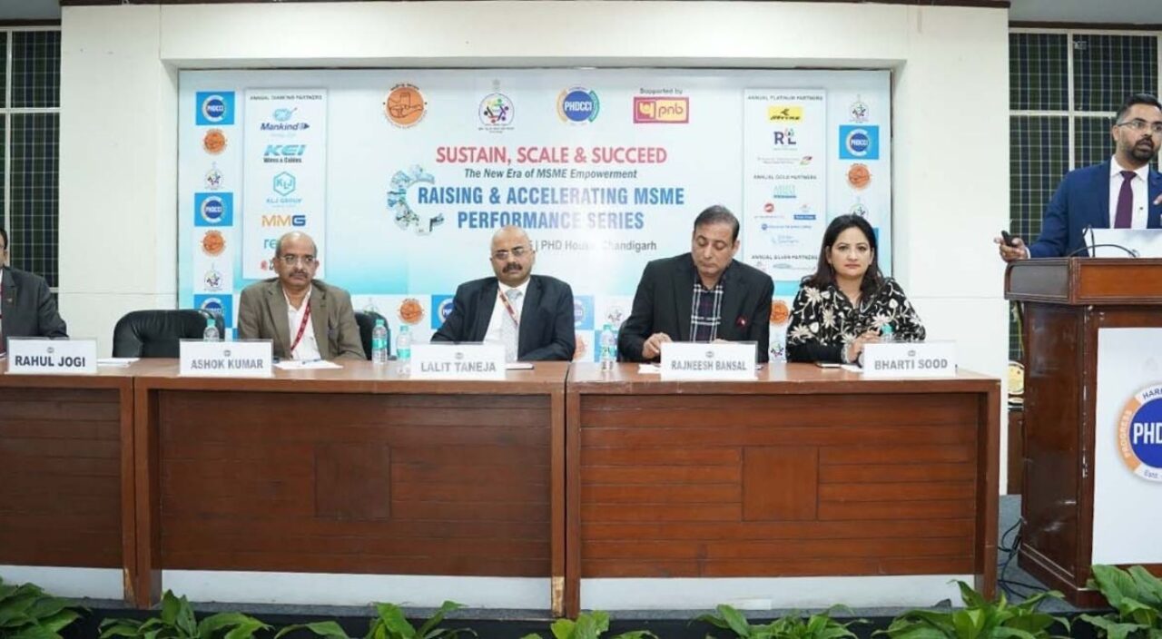 Chandigarh news: (आज समाज): पीएचडी चैंबर ऑफ कामर्स एंड इंडस्ट्री के चंडीगढ़ चेप्टर द्वारा चंडीगढ़ प्रशासन के साथ मिलकर चलाए जा रहे रैंप सीरीज़ के तहत ‘सस्टेन, स्केल एंड सक्सीड:द एरा ऑफ़ एमएसएमई एम्पावरमेंट’ थीम पर सत्र का आयोजन किया। इस अवसर पर चंडीगढ़ चेप्टर के चेयर रजनीश बंसल ने आए हुए अतिथियों का स्वागत करते हुए तकनौलजी को अपनाने, सस्टेनेबिलिटी प्रैक्टिस और फाइनेंशियल तैयारी के ज़रिए एमएसएमई की मजबूती पर ज़ोर दिया।