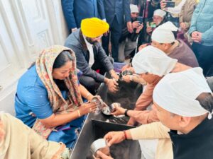 Delhi CM Rekha Gupta Visits Golden Temple | आज समाज नेटवर्क। अमृतसर। दिल्ली की मुख्यमंत्री रेखा गुप्ता अपने कैबिनेट मंत्रियों के साथ गुरु की नगरी अमृतसर पहुंची और हरमंदिर साहिब में शीश निवाया और दरबार साहब में शुकराना अदा किया। मुख्यमंत्री का मानना है कि गुरु कृपा से ही उनकी सरकार ने पिछले माह दिल्ली के ऐतिहासिक लाल किला प्रांगण में गुरु तेग बहादुर जी के 350वें शहीदी दिवस के उपलक्ष्य में तीन दिवसीय ‘गुरमत समागम’ के भव्य व सफल आयोजन किया।