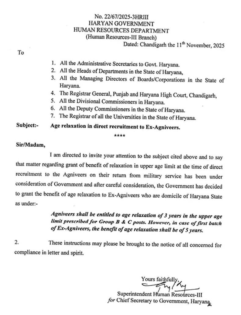 Haryana Agniveer Jobs, (आज समाज), चंडीगढ़: हरियाणा के अग्निवीरों के लिए खुशखबरी है। हरियाणा सरकार ने प्रदेश के अग्निवीरों को सरकारी नौकरी में उम्र में छूट प्रदान की है। आयु सीमा में छूट को लेकर आधिकारिक नोटिफिकेशन जारी हो चुका है। जारी नोटिफिकेशन के मुताबिक अग्निवीरों ग्रुप बी और सी के पदों पर भर्ती में आयु सीमा में 3 वर्ष की छूट देने का फैसला किया गया है। वहीं, अग्निवीरों के पहले बैच को विशेष राहत देते हुए 5 वर्ष तक की आयु सीमा छूट का लाभ प्रदान किया जाएगा।