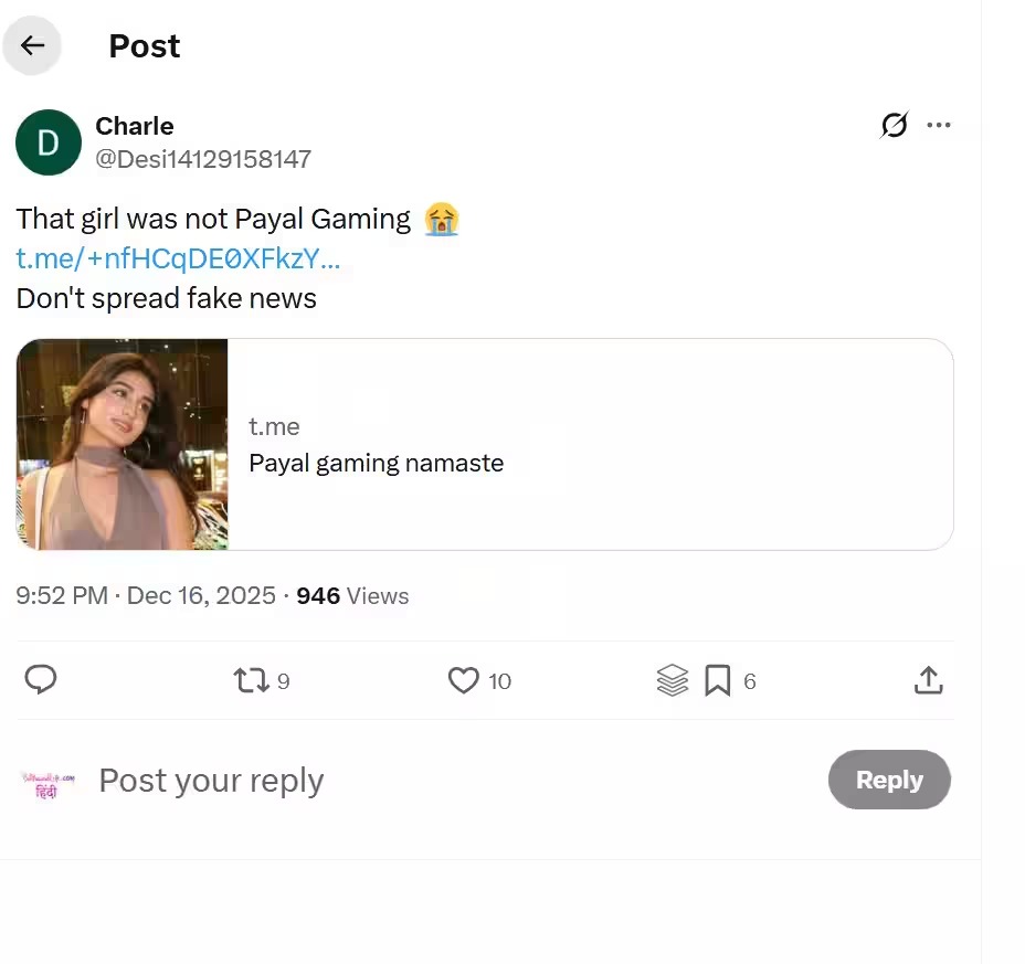 अगर आप वायरल दावों पर यकीन करते हैं, तो असलियत आपको हैरान कर सकती है। फैक्ट-चेकिंग टूल्स ने वीडियो को फेक बताया है, और सोशल मीडिया यूज़र्स यह भी कह रहे हैं कि क्लिप में पायल गेमिंग नहीं हैं। फैंस उनके सपोर्ट में ज़ोरदार तरीके से सामने आए हैं, और कहा है कि वीडियो में दिख रही महिला पायल गेमिंग नहीं हैं।