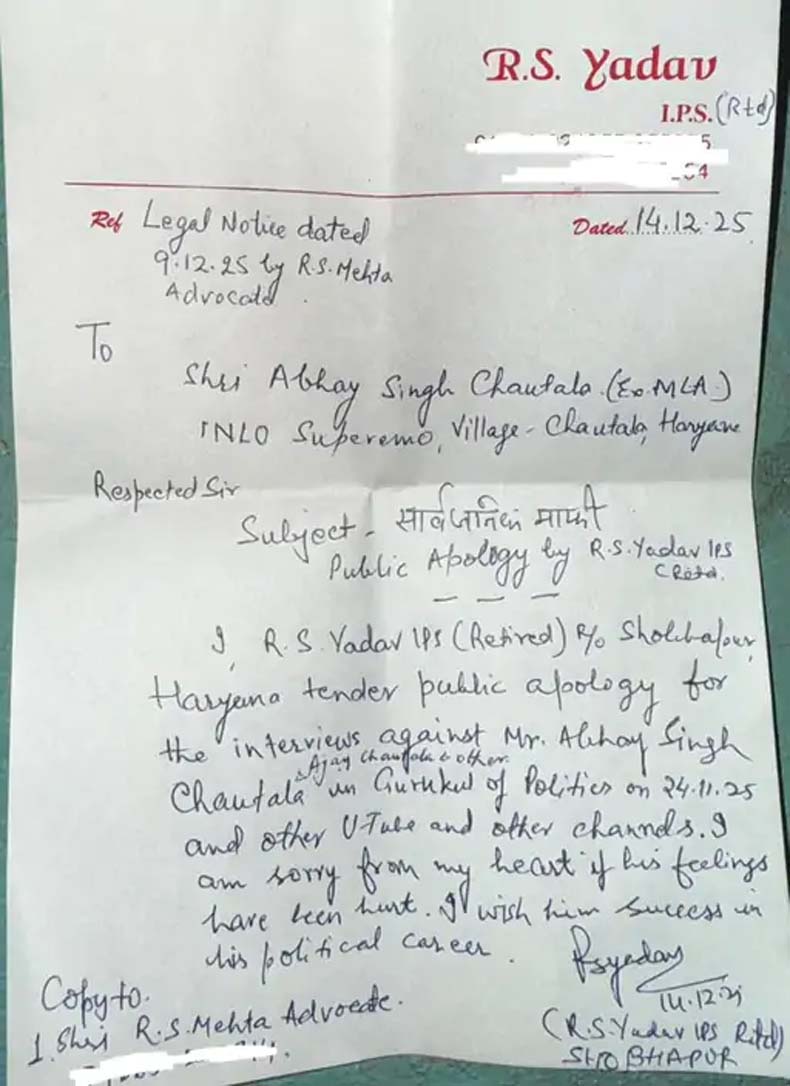 मेरे शब्दों से उनकी भावनाओं को जो ठेस पहुंची है, उसके लिए मैं हृदय से क्षमा चाहता हूं। आरएस यादव ने हाल में एक पॉडकास्ट के दौरान आरोप लगाया था कि चौटाला सरकार के दौरान अभय चौटाला ने पुलिस चौकी में उन्हें 39 छित्तर मारे थे। इसके बाद अभय चौटाला ने आरएस यादव समेत कुछ लोगों को 100 करोड़ रुपए की मानहानि का लीगल नोटिस भेजा था।
